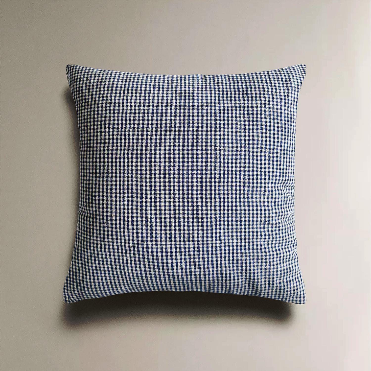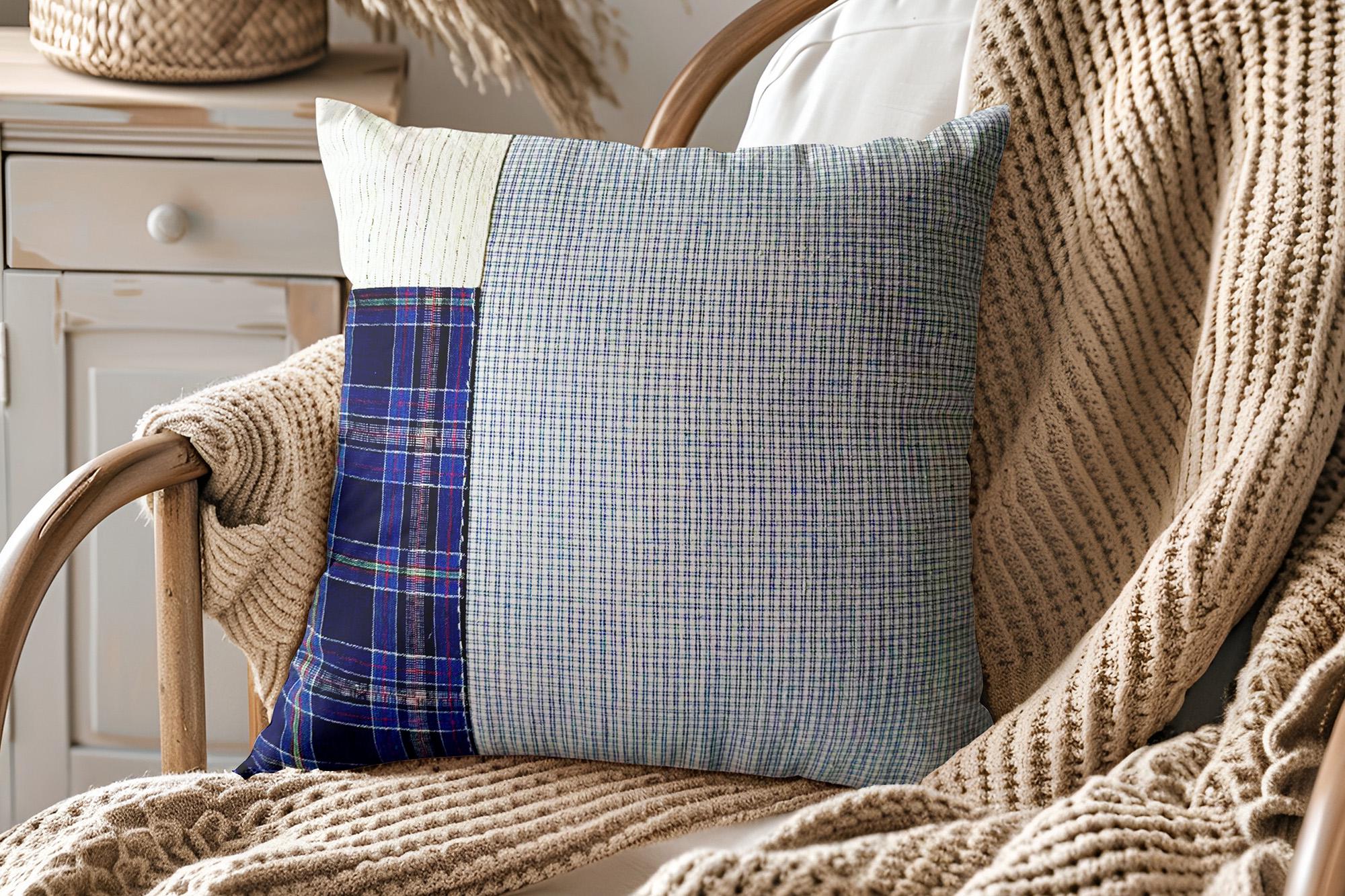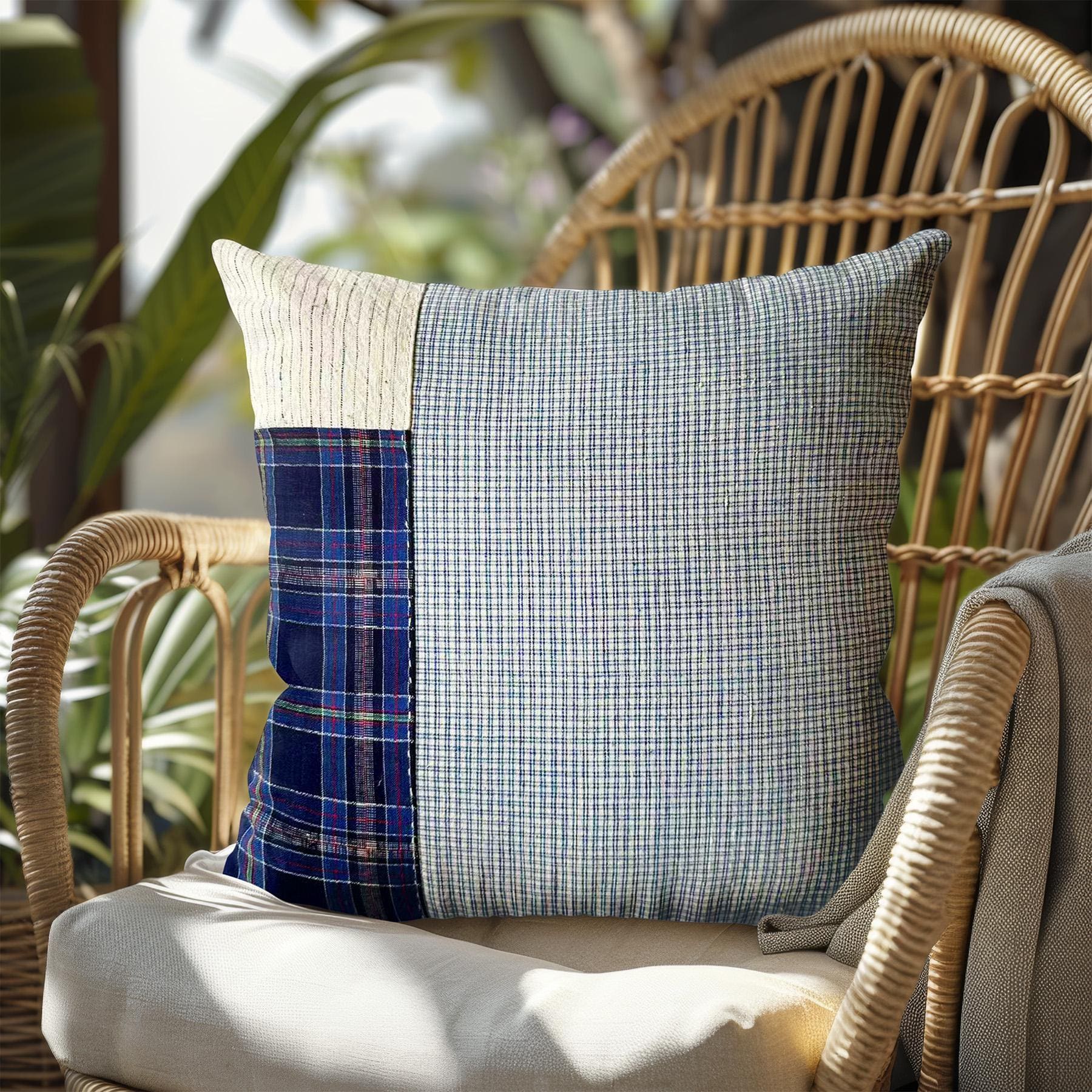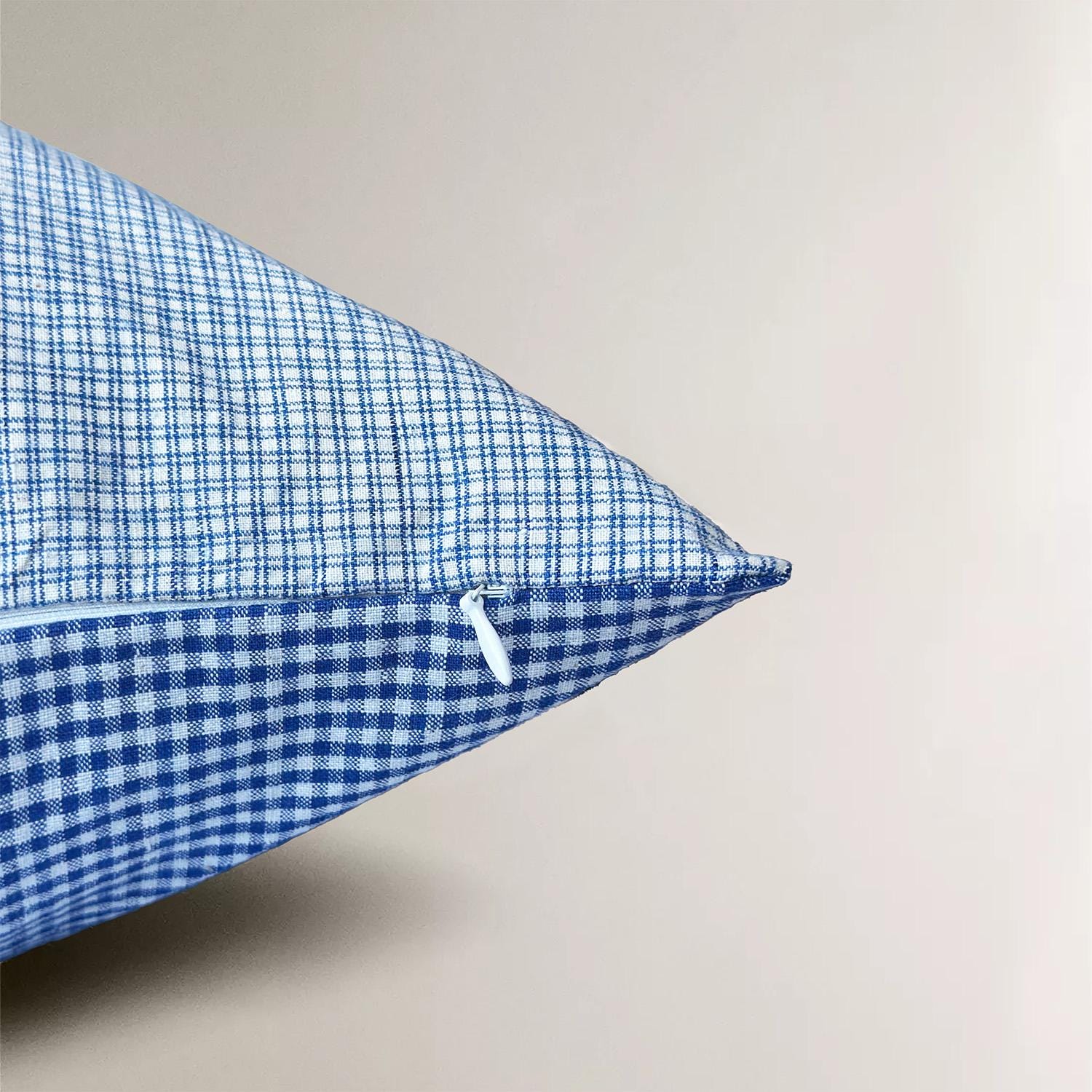 This pillow cover is reversible! One side features a patchwork of gingham squares in tonal blues, while the other showcases a timeless plaid or stripe pattern, offering two distinct looks in one.