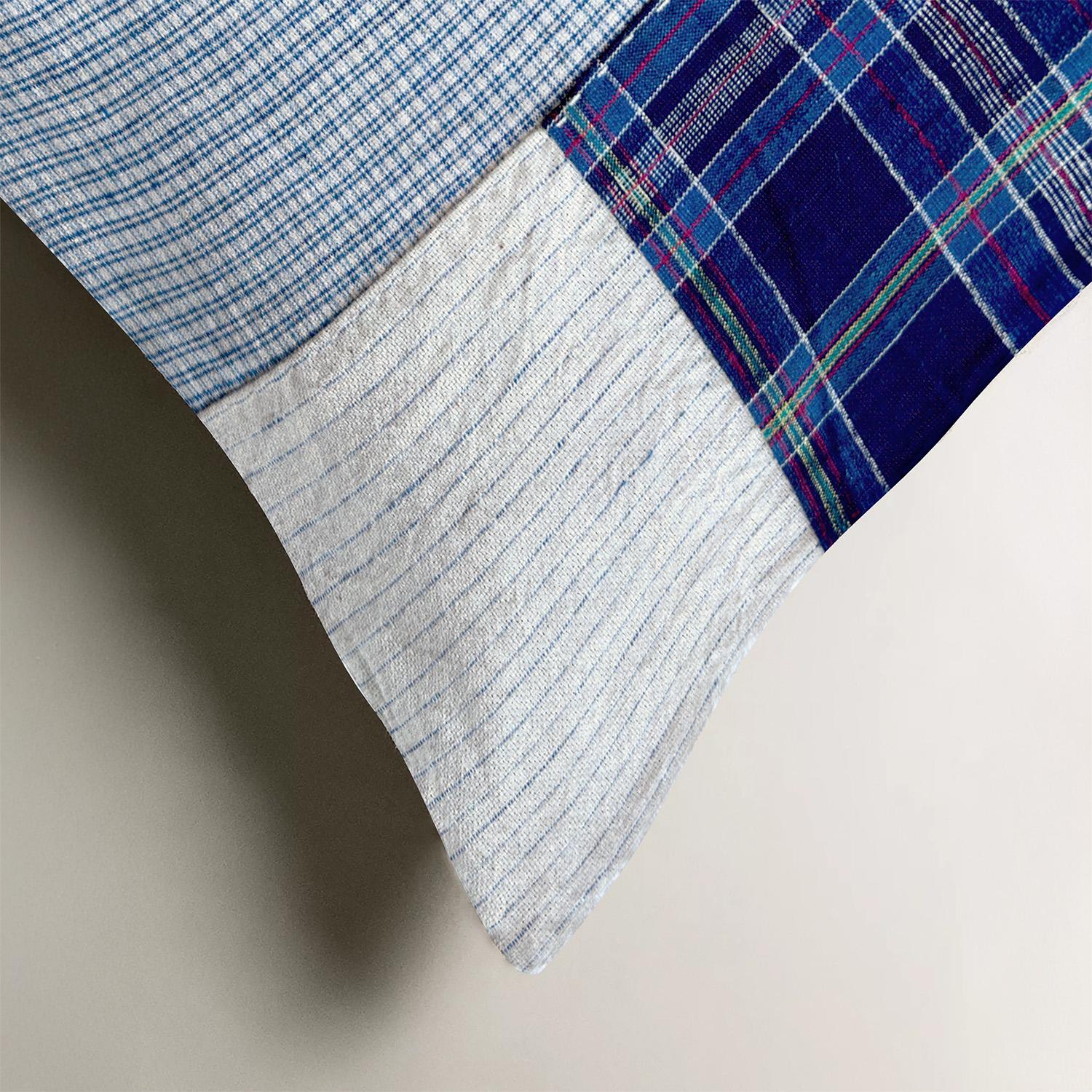 This patchwork pillow cover combines blue and ivory cotton fabrics with gingham and stripe details.