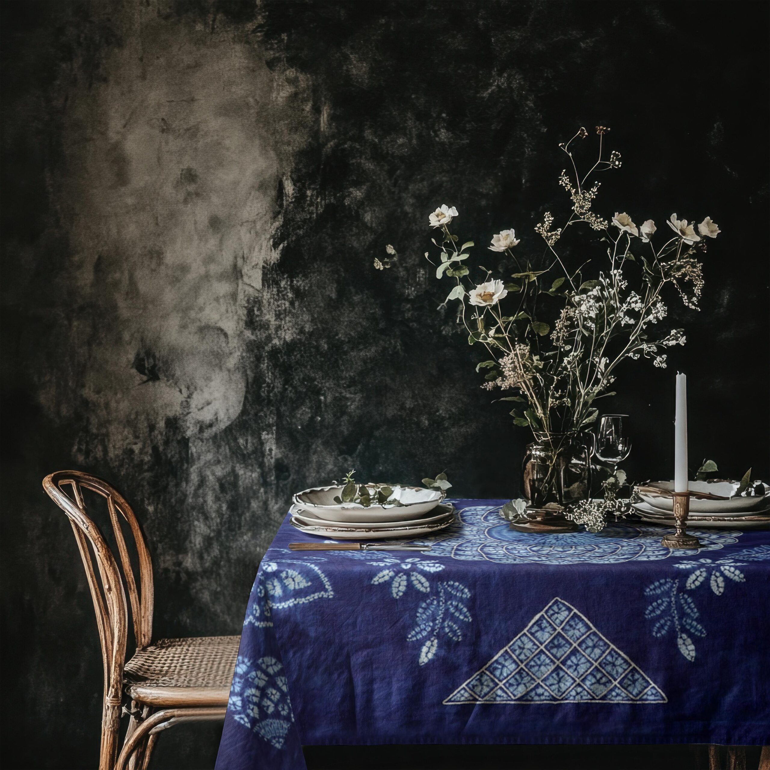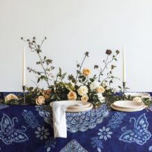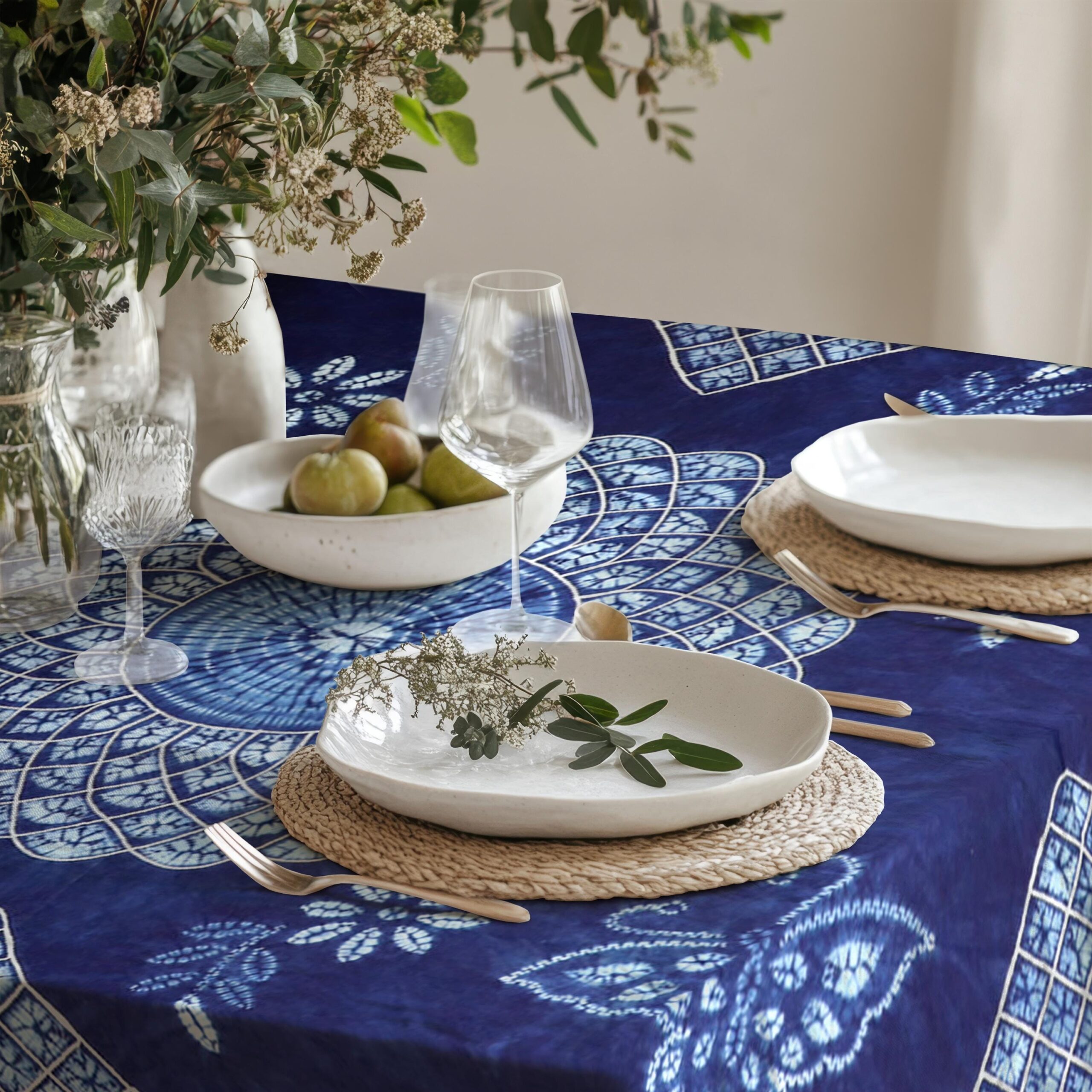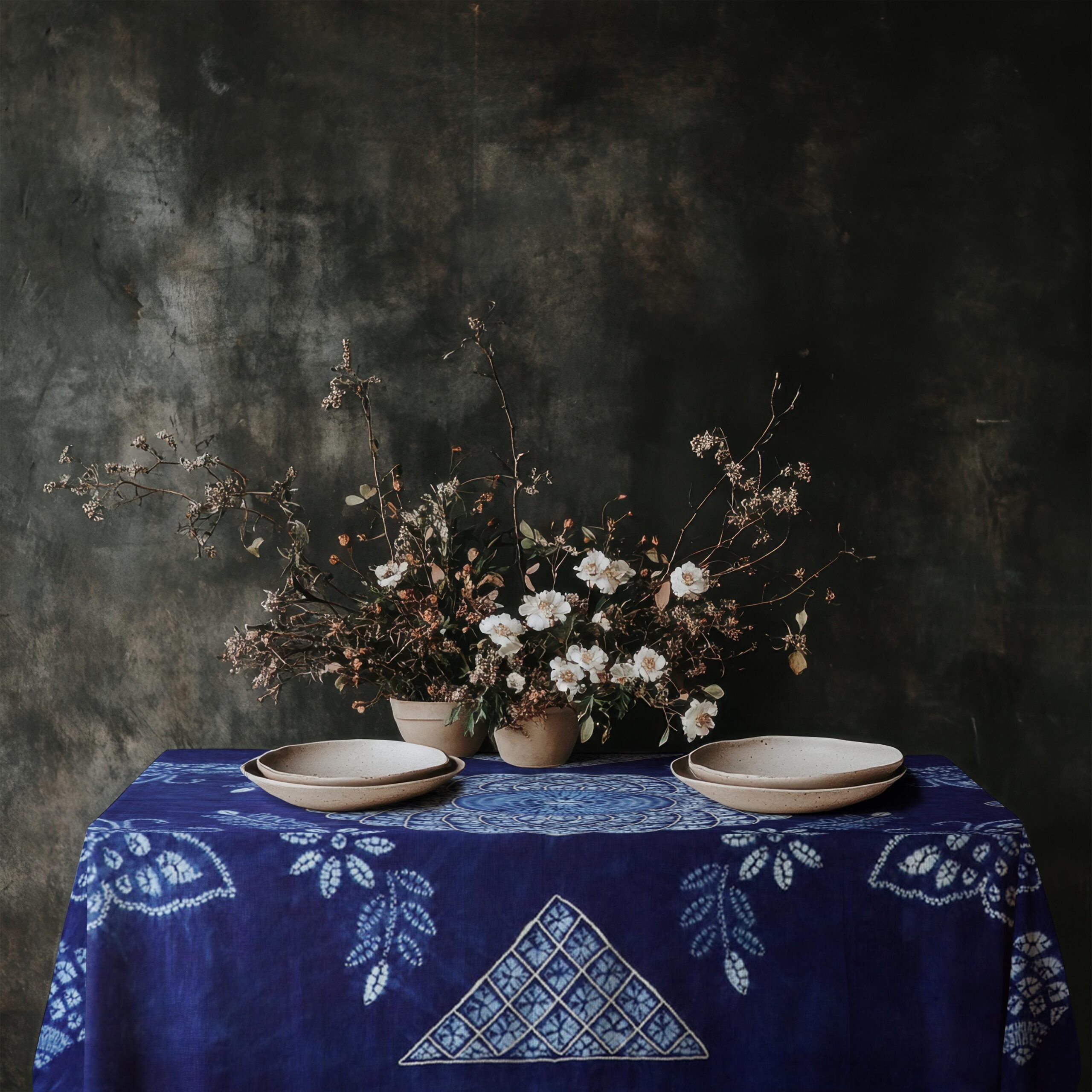 An artful centerpiece for your table, this Hand-Embroidered Butterfly and Flower Tie Dye Indigo Tablecloth is a celebration of a garden in full bloom.