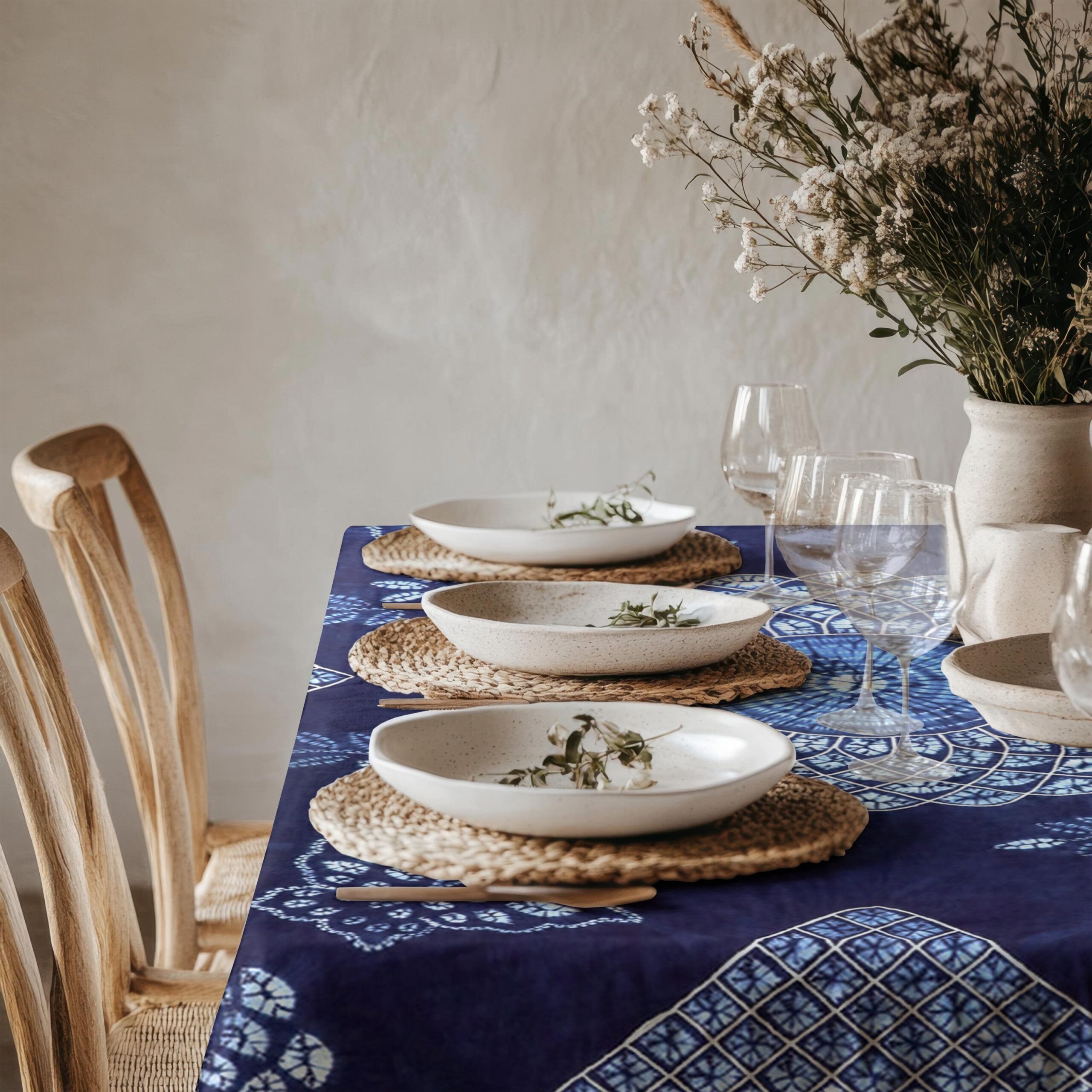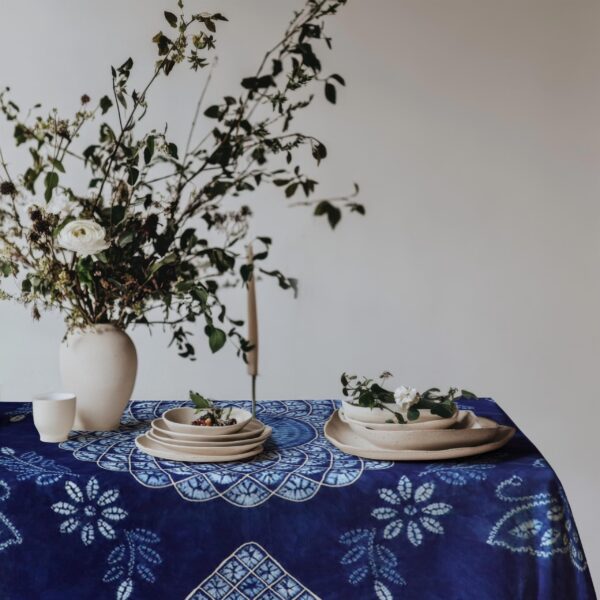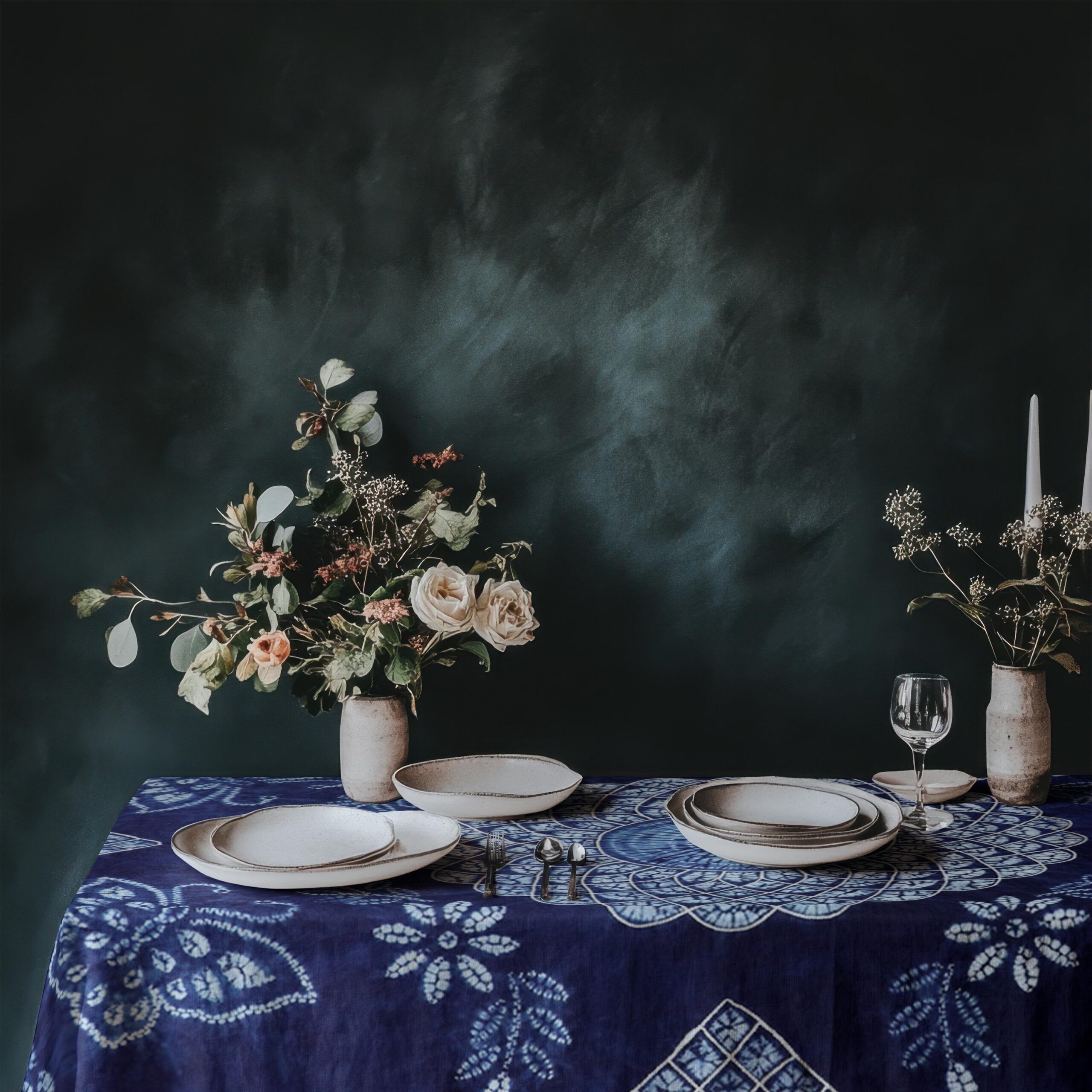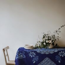 An artful centerpiece for your table, this Hand-Embroidered Butterfly and Flower Tie Dye Indigo Tablecloth is a celebration of a garden in full bloom.