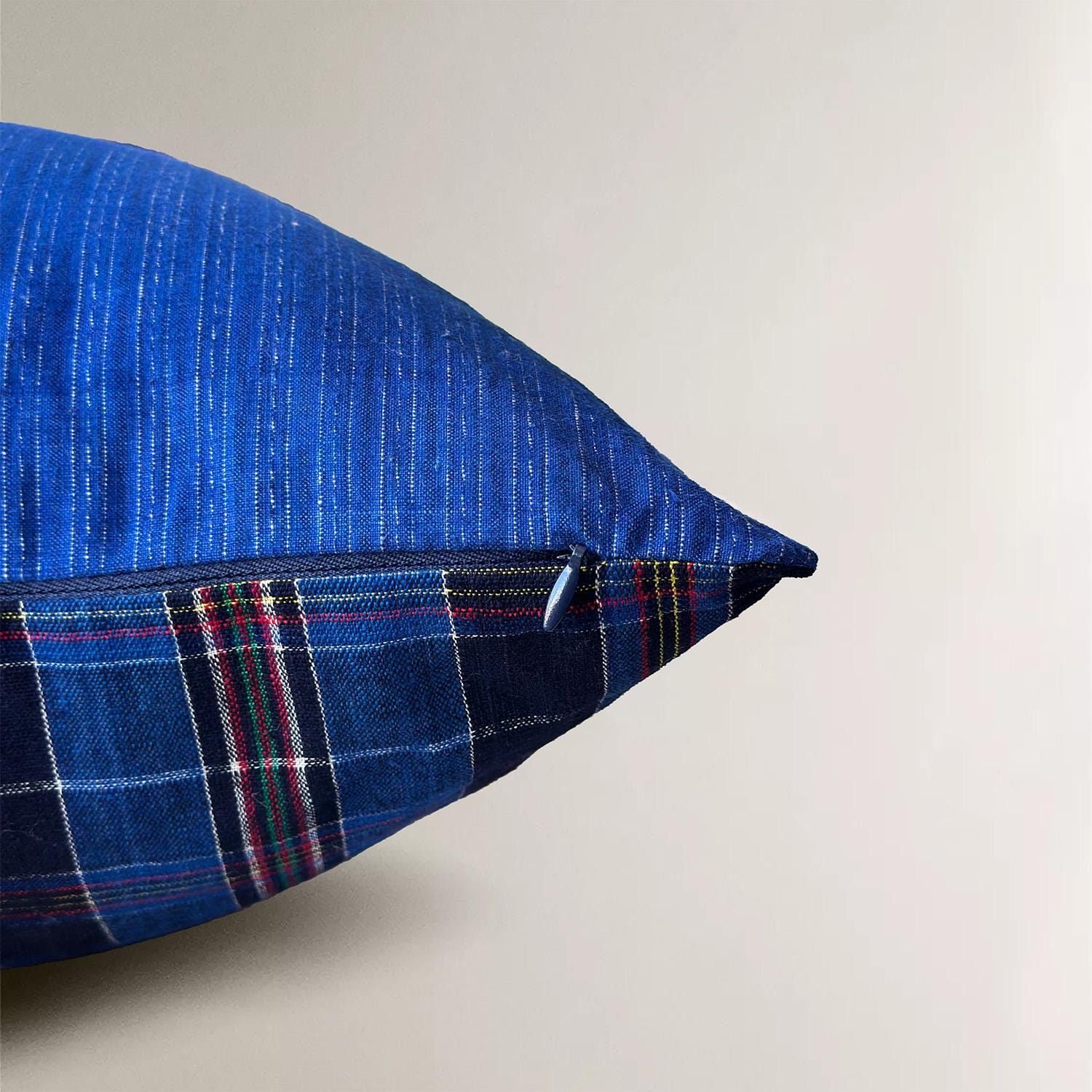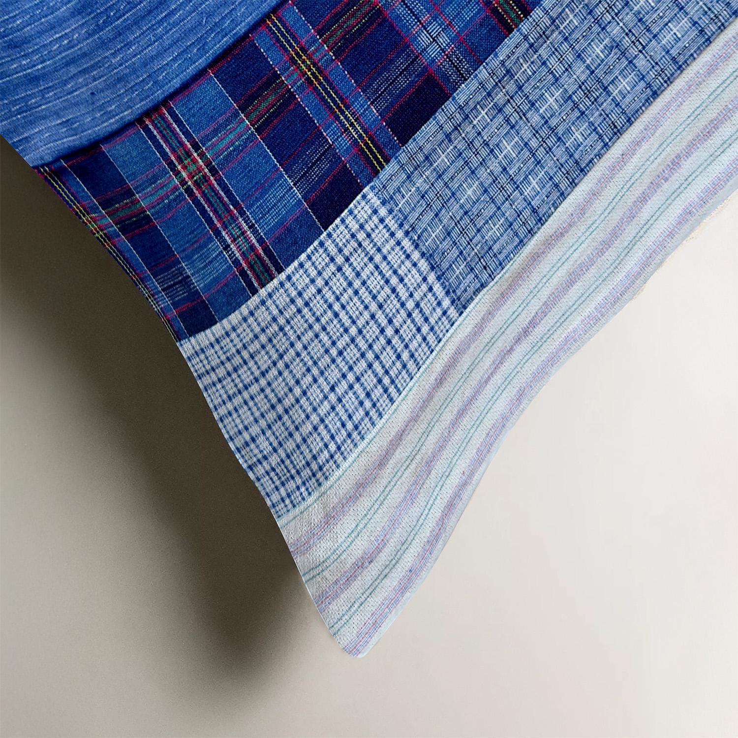 This pillow cover is reversible! One side features a patchwork of gingham squares in tonal blues, while the other showcases a timeless plaid or stripe pattern, offering two distinct looks in one.
