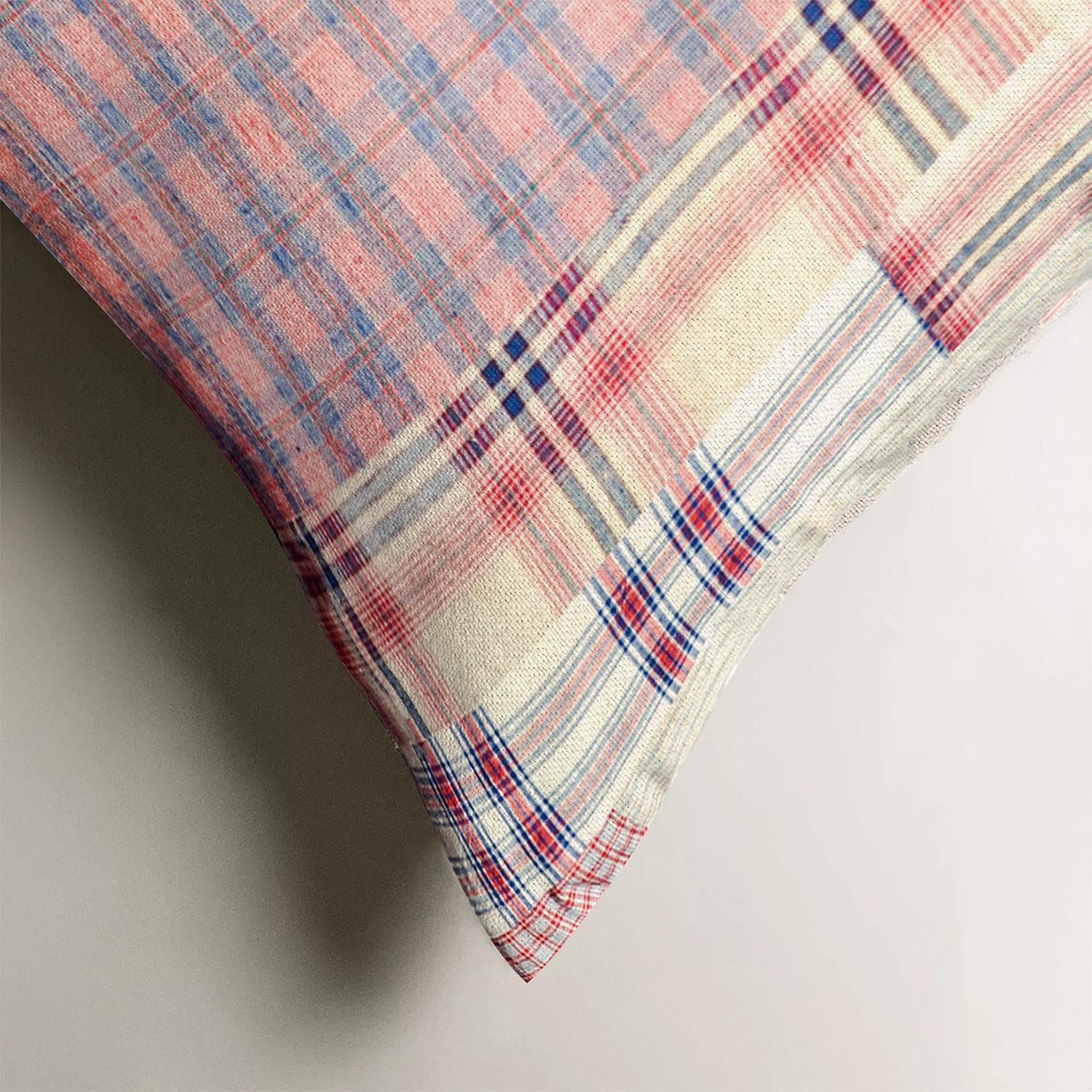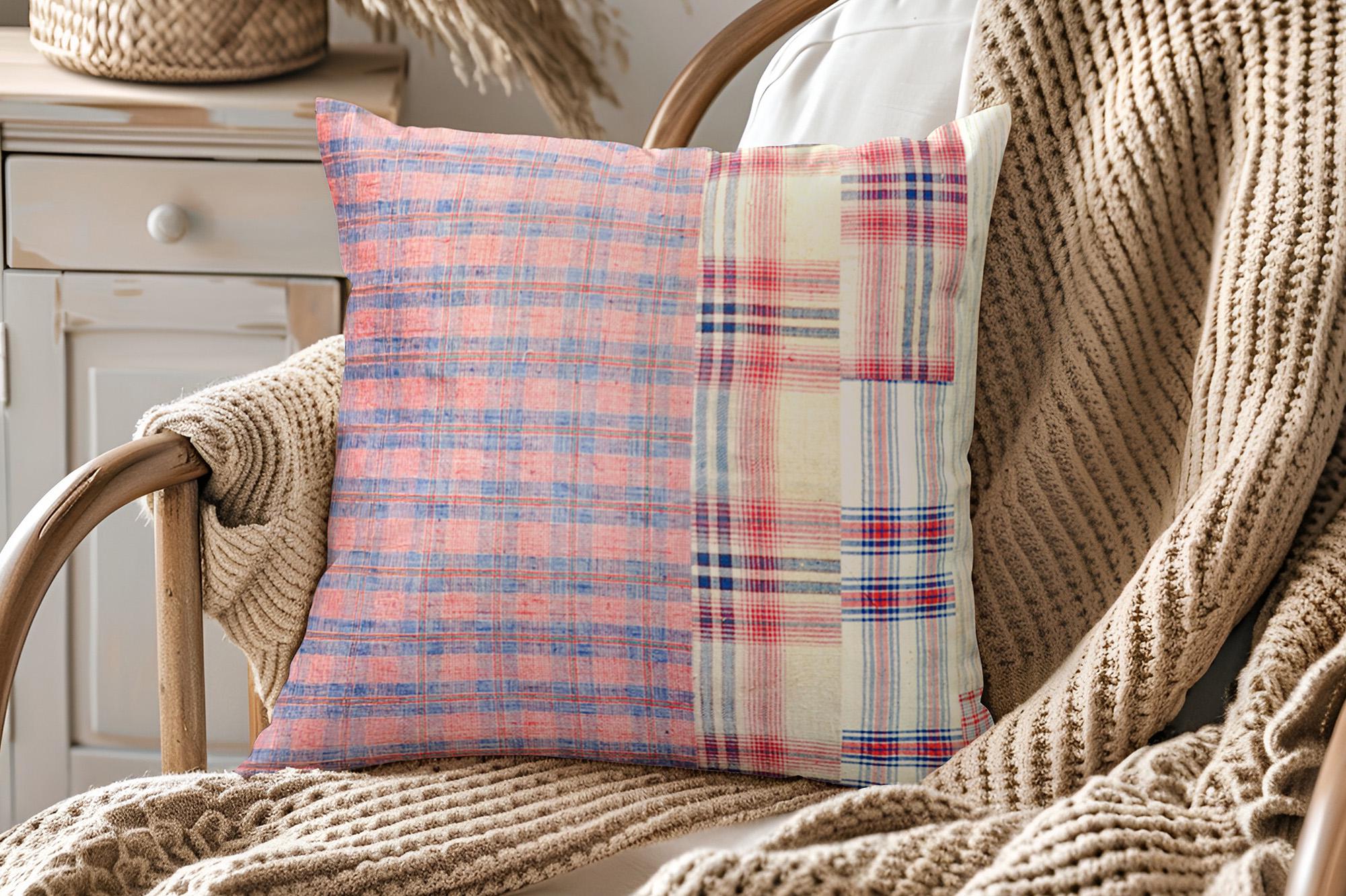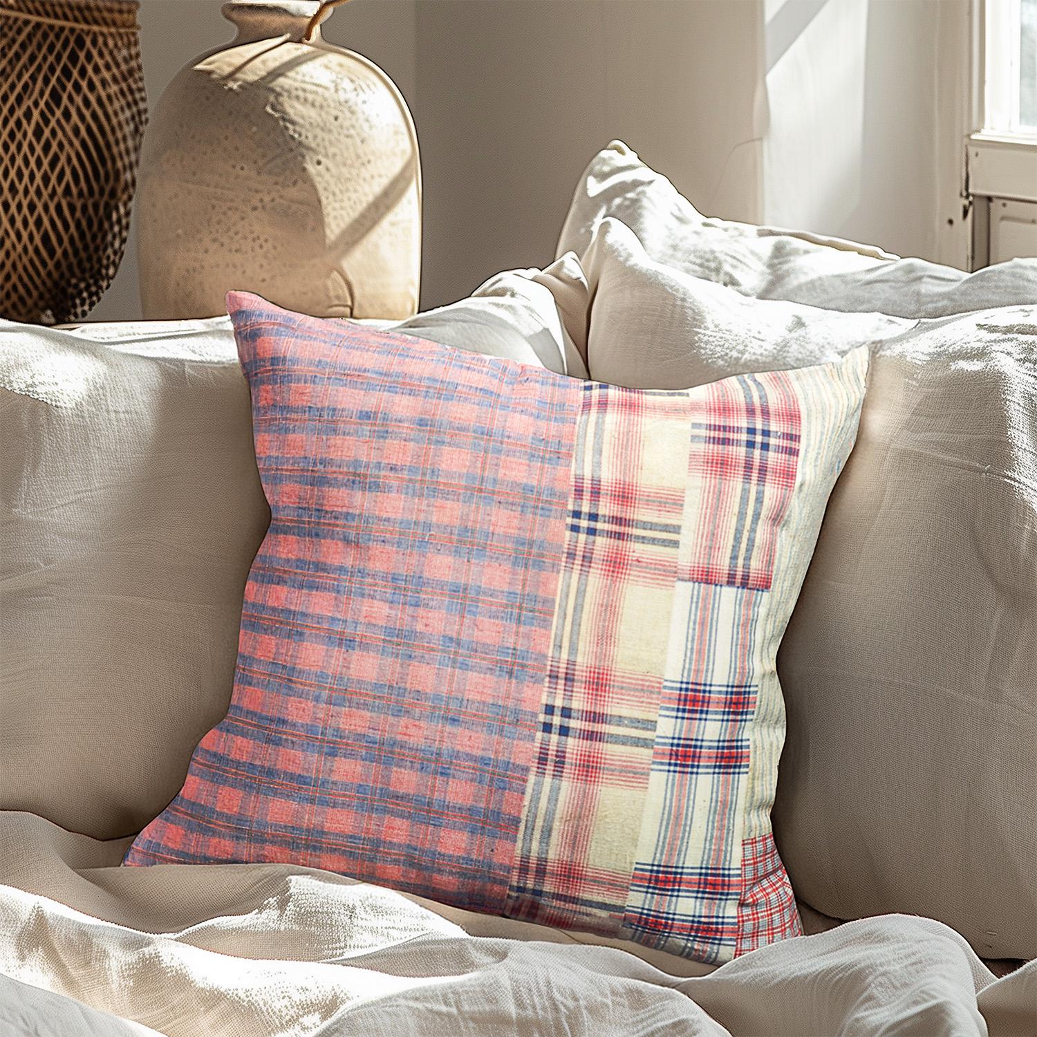 This pillow cover is reversible! One side features a patchwork of gingham squares in tonal red, while the other showcases a timeless plaid or stripe pattern, offering two distinct looks in one.