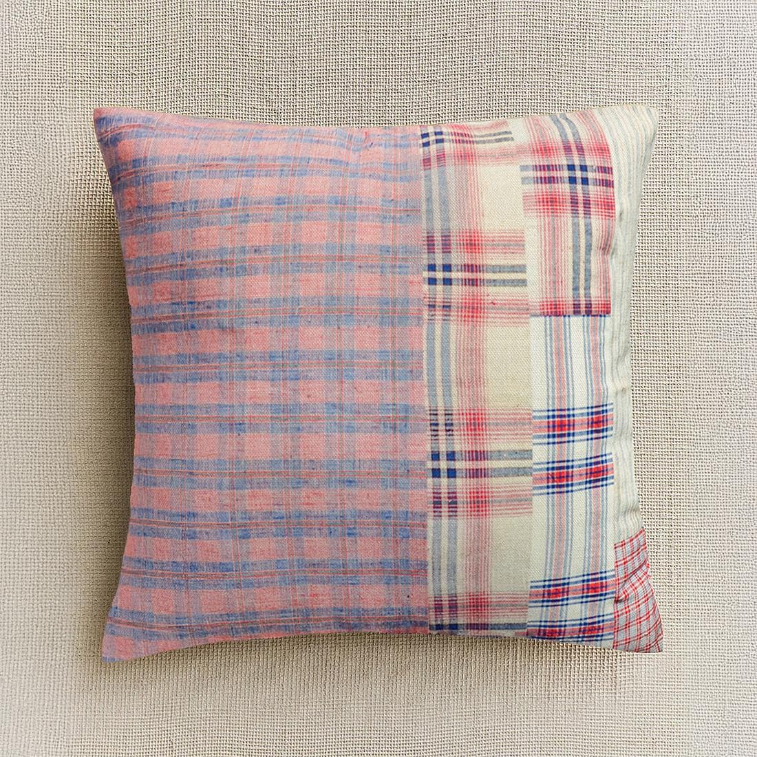 This patchwork pillow cover combines pink and ivory cotton fabrics with gingham and stripe details.