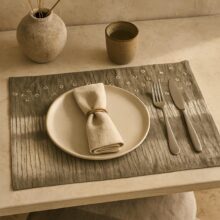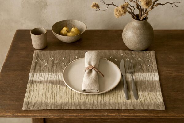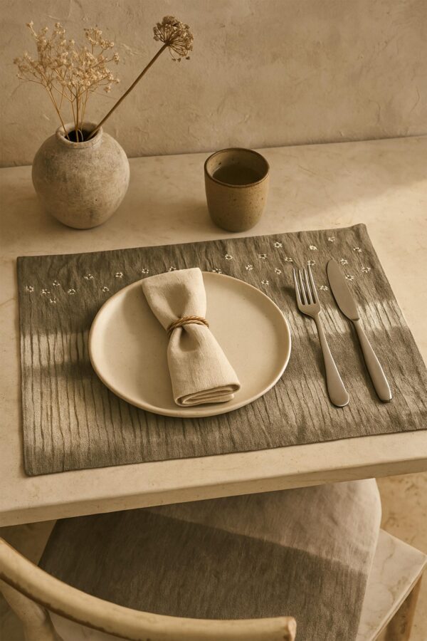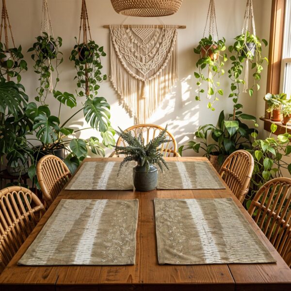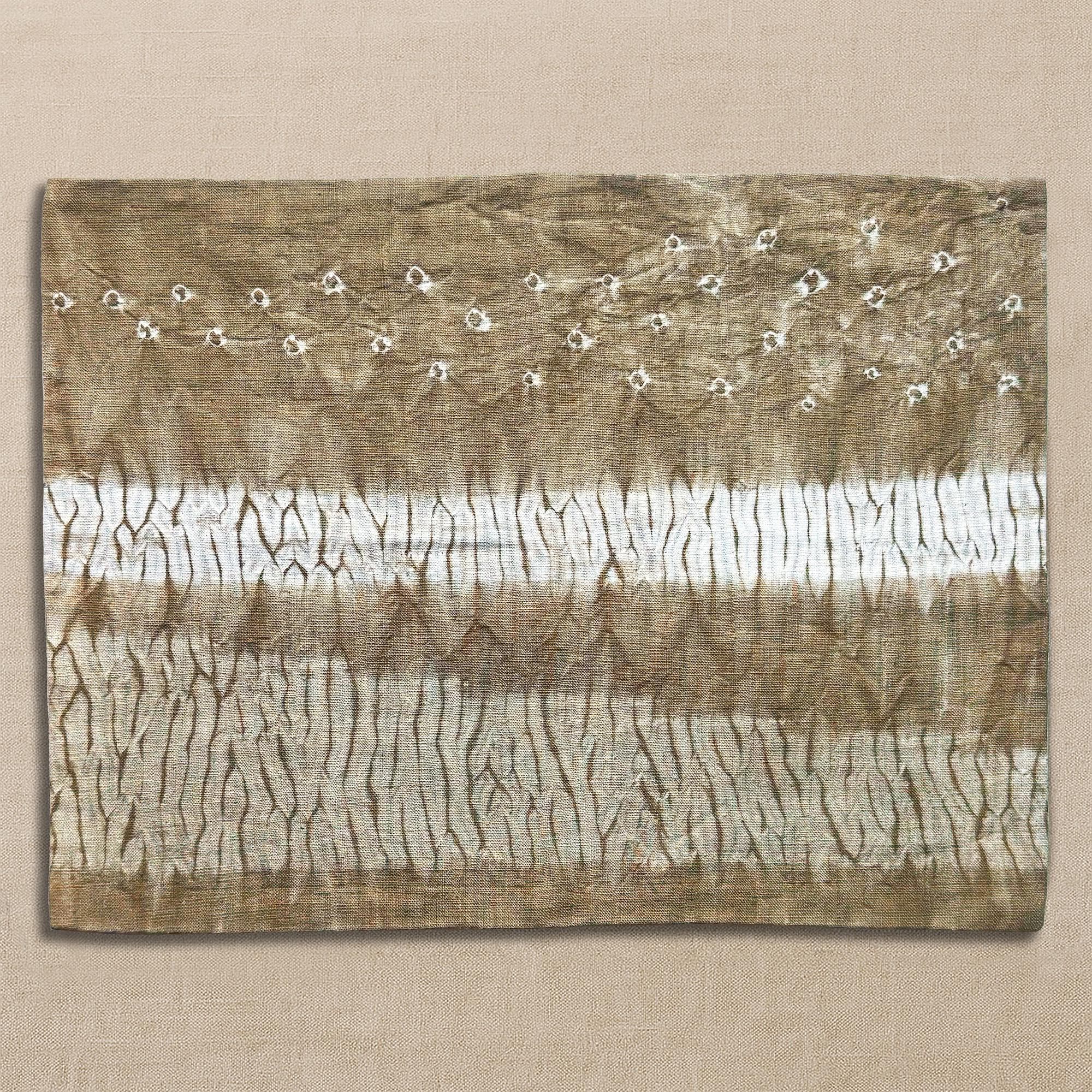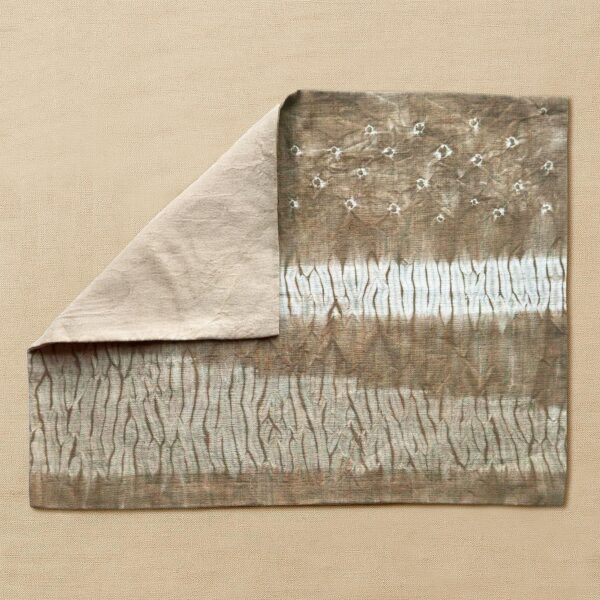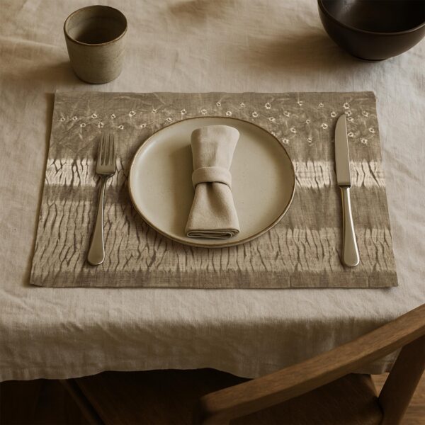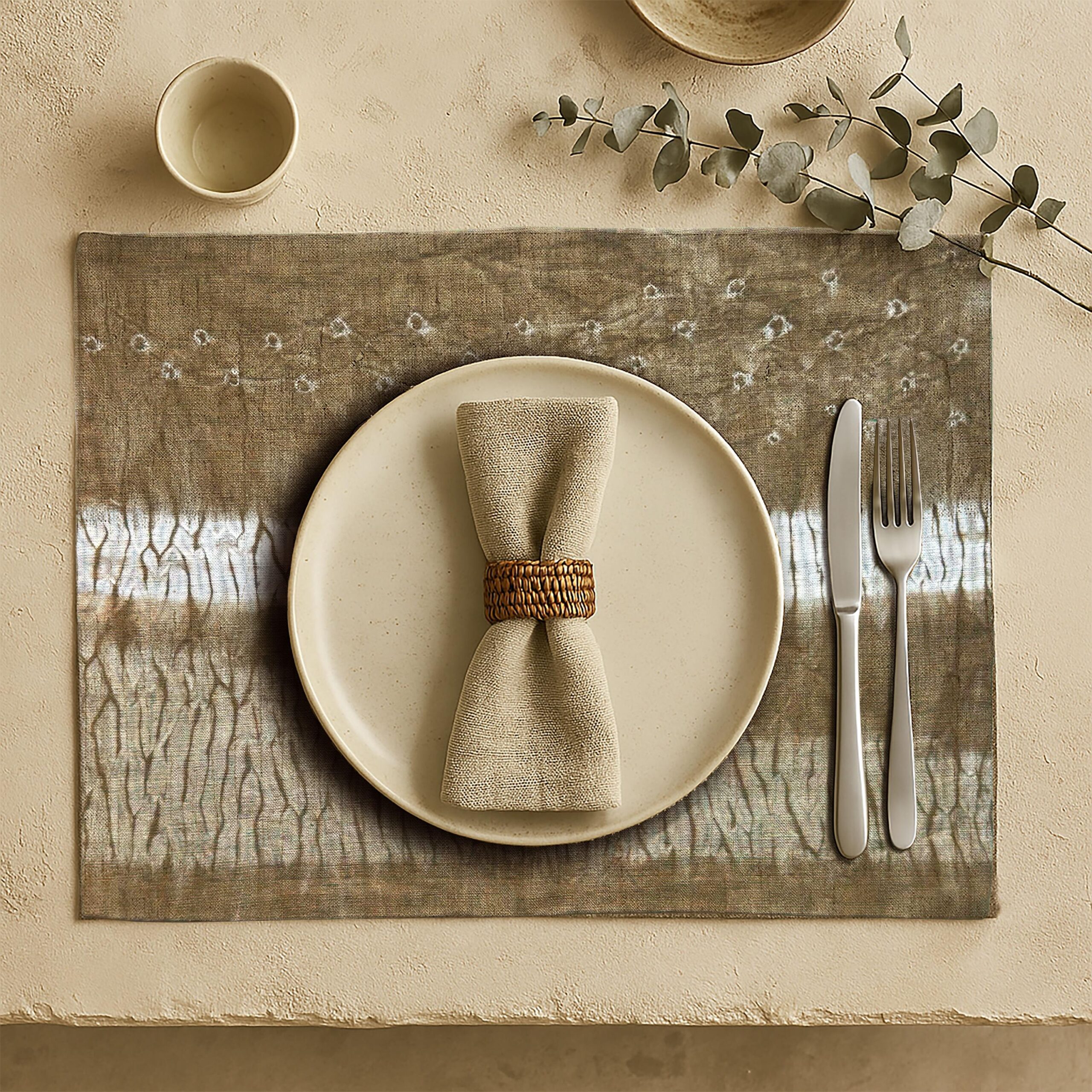 - Dual-Fabric & Reversible Design: This placemat is expertly constructed from two layers of fabric. A rich, textured tie-dye pattern adorns the front, beautifully complemented by a soft, solid beige on the reverse.