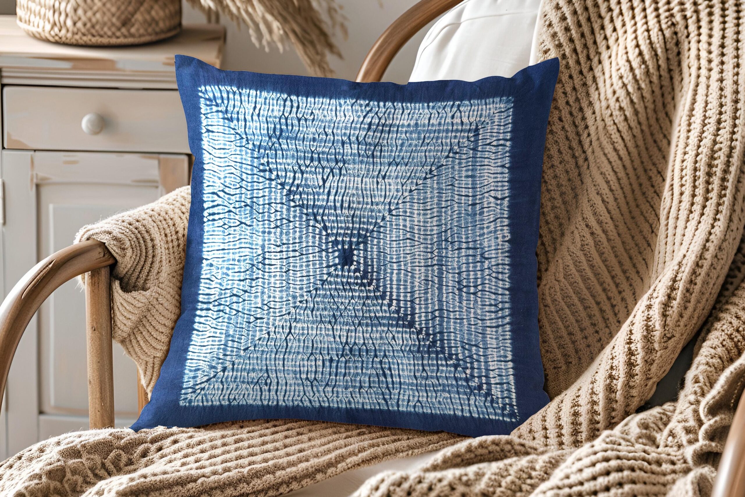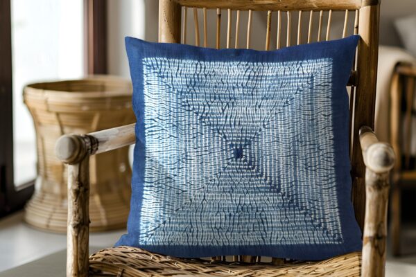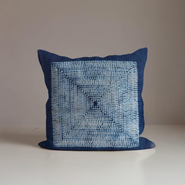 An exceptional handcrafted pillow cover to bring color and artistry to your home. Made from an artisan cloth where threads were first hand-dyed in natural indigo vats in a Bai village in Yunnan. The intricate tie-dye patterns were then meticulously created by a master artisan from Dali. Each piece is unique and carries the story of a millennia-old craft.